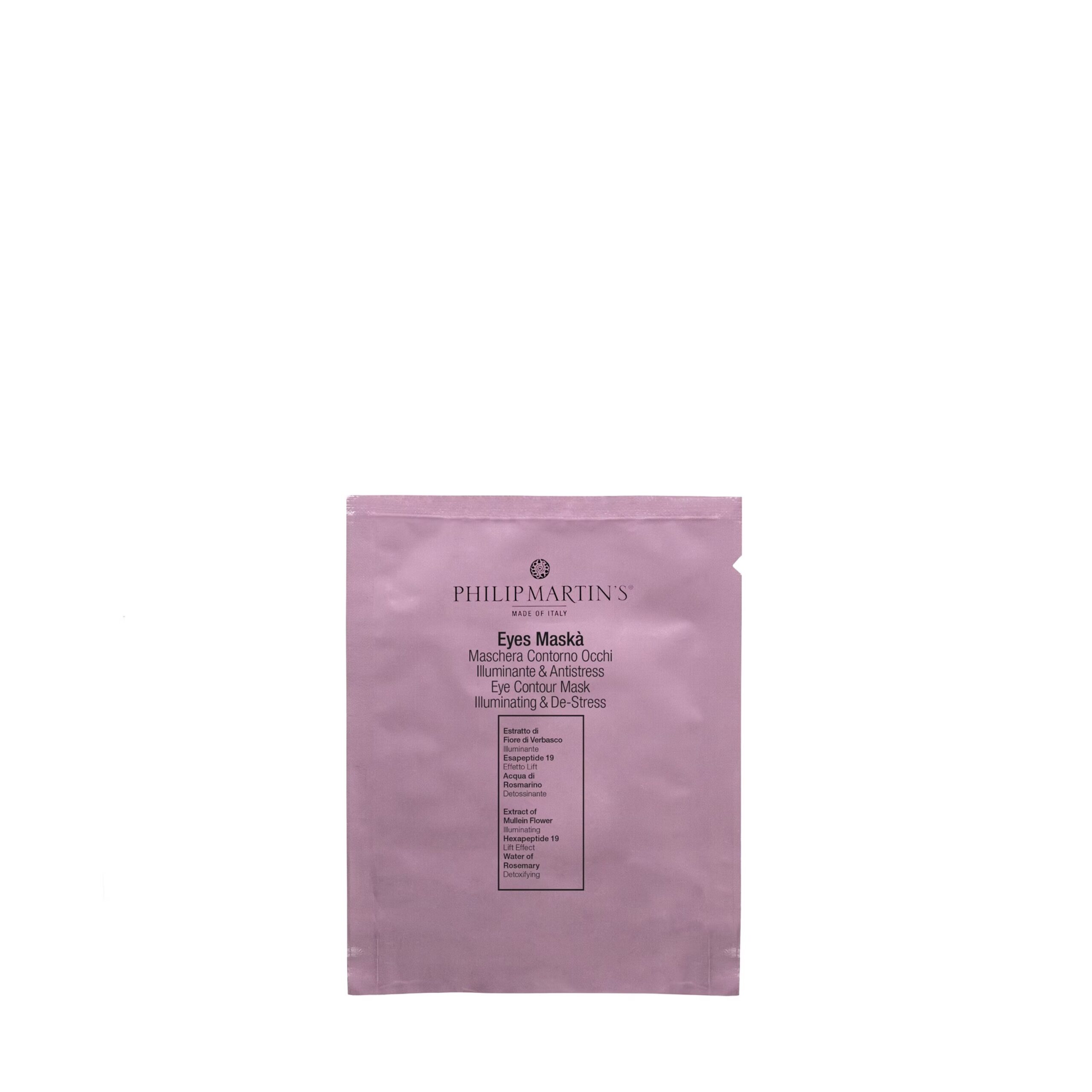Ideálna maska na matné oblasti okolo očí a s výraznými vráskami. Maska na oči s extraktom z kvetov divozelu s rozjasňujúcim účinkom a hexapeptidom 19 s liftingovým efektom pomáha uvoľniť oblasť okolo očí a dodáva pohľadu svieži a oddýchnutý vzhľad. Rozmarínová voda a organický extrakt z harmančeka majú upokojujúci a osviežujúci účinok.